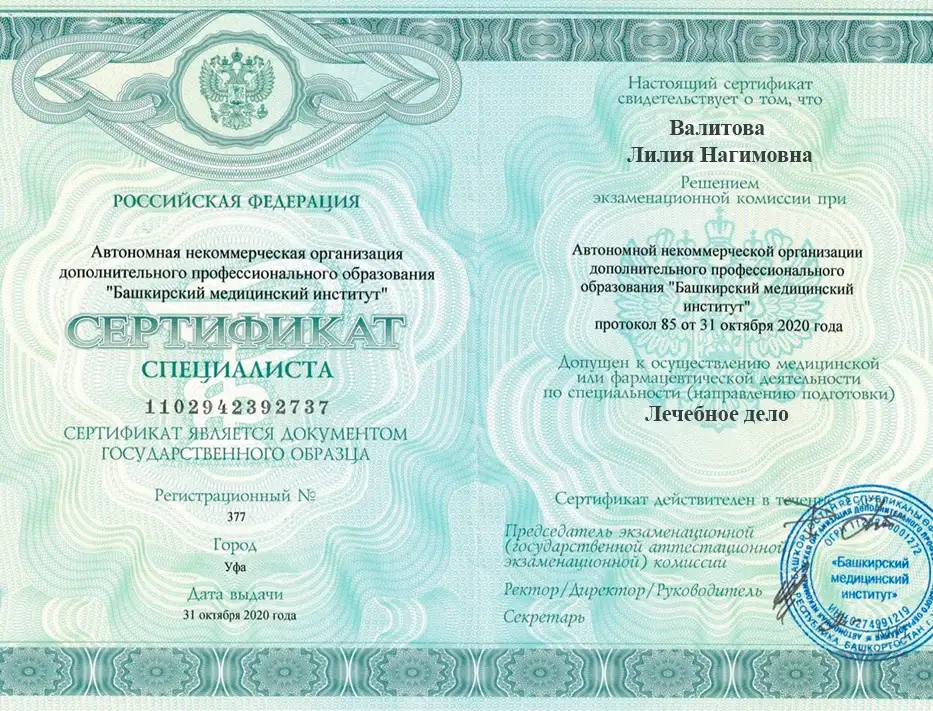 • 2020 – Башкирский государственный медицинский институт – аккредитация по специальности "лечебное дело".
